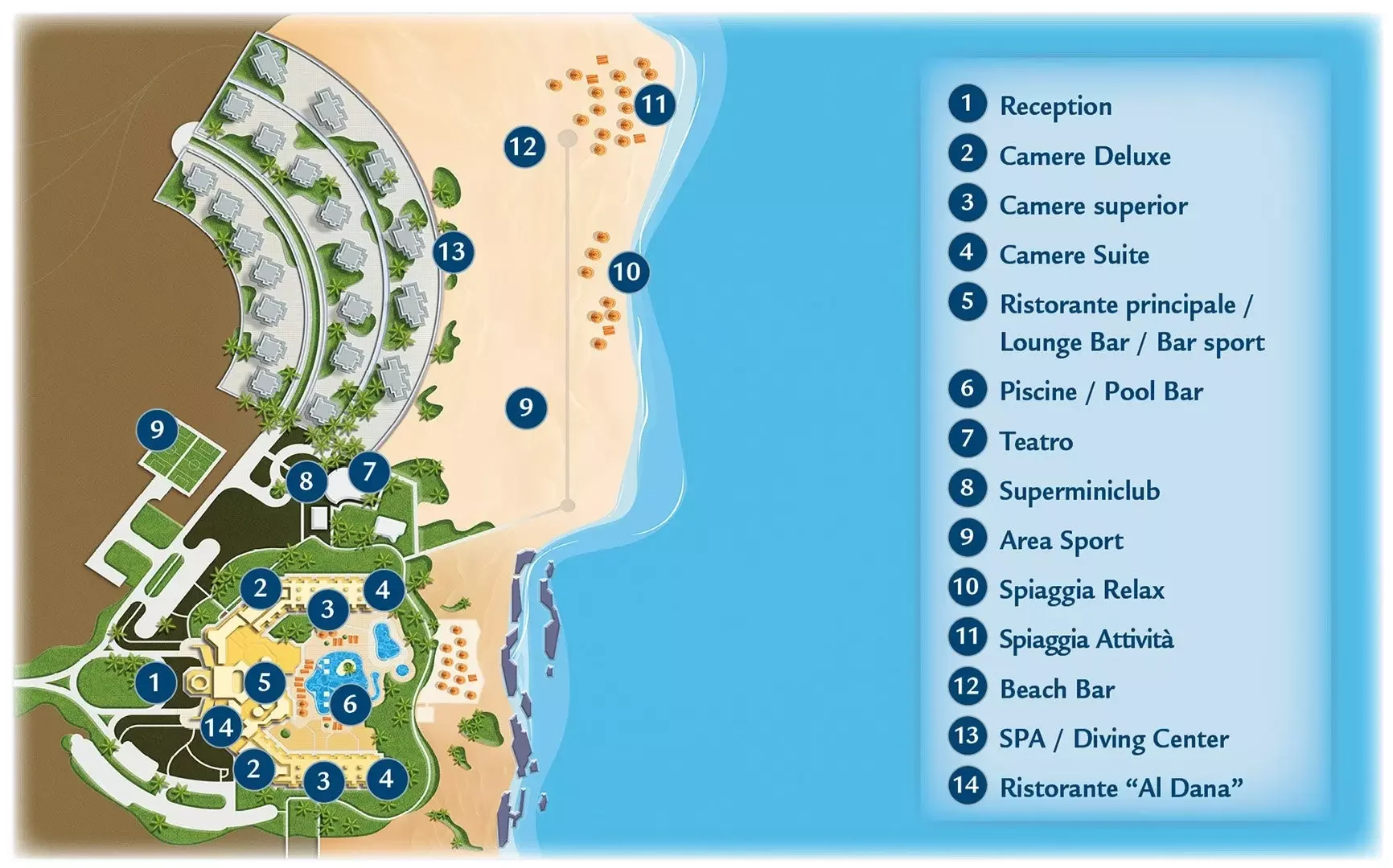 Il litorale di fronte al Resort è in parte sabbioso e in parte roccioso; sono presenti vari punti attrezzati con ombrelloni e lettini gratuiti fino ad esaurimento. Teli mare gratuiti. Il colore bianco della sabbia e la limpidezza dell’acqua ne fanno uno dei punti mare più apprezzati di Salalah.